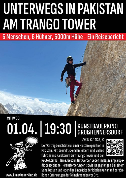 In diesem Vortrag wird von einer Kletterexpedition in Pakistan berichtet. Mit eindrucksvollen Bildern und Videoausschnitten nehmen sie das Publikum mit in ein faszinierendes Land und an die berühmte Kletterroute Eternal Flame im Karakorum-Gebirge am Trango Tower. Sie geben Einblicke in ihr Leben im Basecamp, die Herausforderungen der Expedition und ihre einzigartige Erfahrung, eine Schule zu besuchen und dabei spannende Begegnungen sowie einen lebendigen Eindruck einer anderen Kultur zu gewinnen.